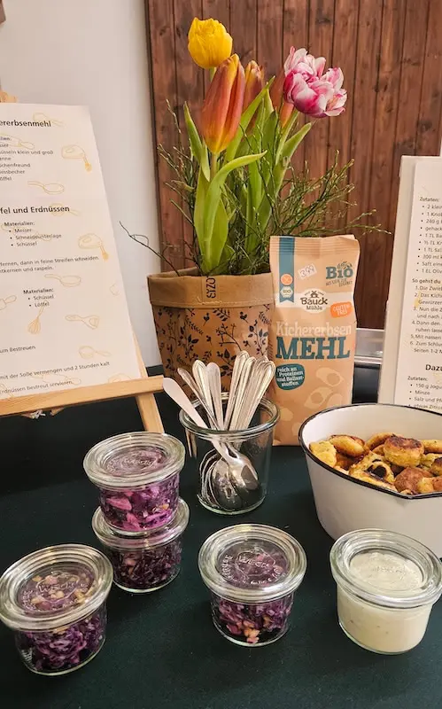 Heute ist wieder Probiertag: Falafelbällchen mit Kichererbsenmehl und Joghurt-Minze-Dip sowie Rotkrautsalat mit Apfel und Erdnüssen. Selbstgemacht in unserer Hofküche! 😋 Die Rezepte gibt’s bei uns zum Mitnehmen!